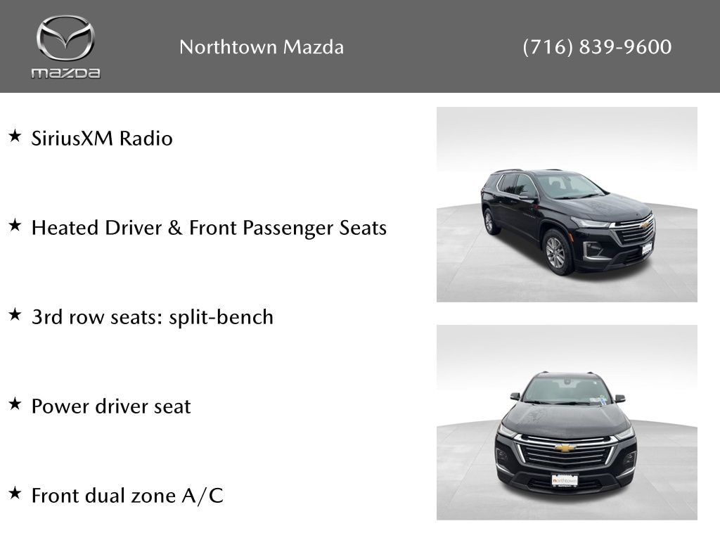 See the rest of our inventory at: NORTHTOWN MAZDA.COM Convenience & Driver Confidence Package (4.2" Multi-Color Enhanced Driver Instrument Display, Heated Driver & Front Passenger Seats, Radio: Chevrolet Infotainment 3 Plus System, Rear Power Liftgate, Remote Start, SiriusXM w/360L, and Universal Home Remote), Floor Liner Package (LPO) (1st & 2nd Row All-Weather Floor Liner (LPO), 3rd Row All-Weather Floor Liner (LPO), and Integrated Cargo Liner (LPO)), Front License Plate Bracket Mounting Package, Preferred Equipment Group 1LT, 2-Way Manual Front Passenger Seat Adjuster, 3.49 Axle Ratio, 3rd row seats: split-bench, 4-Wheel Disc Brakes, 6 Speakers, 6-Speaker Audio System Feature, 8-Way Power Driver Seat Adjuster, ABS brakes, Air Conditioning, Alloy wheels, AM/FM radio: SiriusXM, Apple CarPlay/Android Auto, Auto High-beam Headlights, Automatic temperature control, Black Roof Rails, Brake assist, Bumpers: body-color, Compass, Delay-off headlights, Driver door bin, Driver vanity mirror, Dual front impact airbags, Dual front side impact airbags, Electronic Stability Control, Emergency communication system, Exterior Parking Camera Rear, Four wheel independent suspension, Front anti-roll bar, Front Bucket Seats, Front Center Armrest, Front dual zone A/C, Front reading lights, Fully automatic headlights, Heated door mirrors, Illuminated entry, Leather steering wheel, Low tire pressure warning, Not Equipped w/Rear Park Assist (060), Occupant sensing airbag, Outside temperature display, Overhead airbag, Overhead console, Panic alarm, Passenger door bin, Passenger vanity mirror, Power door mirrors, Power Driver Lumbar Control, Power driver seat, Power steering, Power windows, Premium Cloth Seat Trim, Radio data system, Radio: Chevrolet Infotainment System AM/FM Stereo, Rear air conditioning, Rear anti-roll bar, Rear reading lights, Rear window defroster, Rear window wiper, Remote keyless entry, Security system, SiriusXM Radio, Speed control, Speed-sensing steering, Spoiler, Steering wheel mounted audio controls, Tachometer, Telescoping steering wheel, Tilt steering wheel, Traction control, Trip computer, Turn signal indicator mirrors, Variably intermittent wipers, Voltmeter, and Wheels: 18" Bright Silver-Painted Aluminum.
