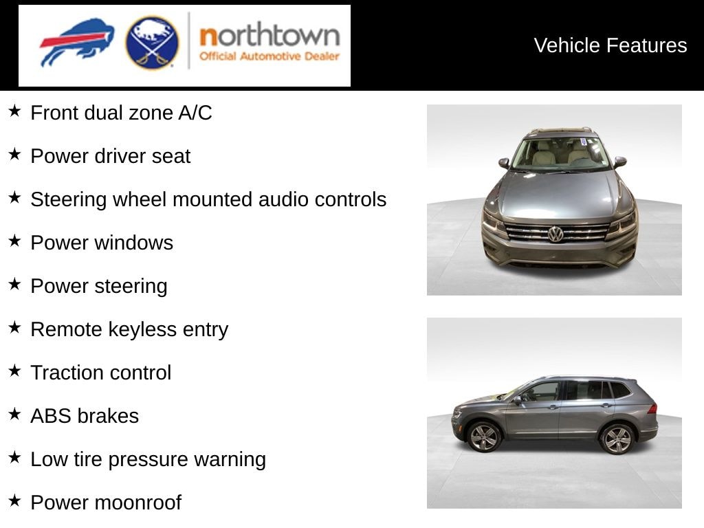 See the rest of our inventory at NorthtownCDJ.com ABS brakes, Active Cruise Control, Alloy wheels, Compass, Electronic Stability Control, Front dual zone A/C, Heated door mirrors, Heated Front Comfort Seats, Heated front seats, Illuminated entry, Low tire pressure warning, Navigation System, Power driver seat, Power Liftgate, Power moonroof, Power steering, Power windows, Remote keyless entry, Steering wheel mounted audio controls, Traction control, 3.33 Axle Ratio, 4-Wheel Disc Brakes, 4-Wheel Independent Suspension, 6 Speakers, Air Conditioning, AM/FM radio: SiriusXM with 360L, Auto-dimming Rear-View mirror, Automatic temperature control, Brake assist, Bumpers: body-color, Delay-off headlights, Driver door bin, Driver vanity mirror, Dual front impact airbags, Dual front side impact airbags, Emergency communication system: VW Car-Net services (capabilities require enrollment or subscription), Exterior Parking Camera Rear, Forward collision: FCW w/Autonomous Emergency Braking mitigation, Four wheel independent suspension, Front anti-roll bar, Front Bucket Seats, Front Center Armrest, Front fog lights, Front reading lights, Fully automatic headlights, Heated steering wheel, Leather Shift Knob, Navigation system: VW Car-Net Guide & Inform, Occupant sensing airbag, Outside temperature display, Overhead airbag, Overhead console, Panic alarm, Passenger door bin, Passenger vanity mirror, Perforated V-Tex Leatherette Seating Surfaces, Power door mirrors, Radio data system, Radio: MIB3 Discover Media AM/FM/HD, Rain sensing wipers, Rear anti-roll bar, Rear reading lights, Rear seat center armrest, Rear window defroster, Rear window wiper, Roof rack: rails only, Security system, Speed control, Speed-sensing steering, Split folding rear seat, Spoiler, Tachometer, Telescoping steering wheel, Tilt steering wheel, Trip computer, Turn signal indicator mirrors, Variably intermittent wipers, and Wheels: 19" 5-Spoke Gray AlloY.